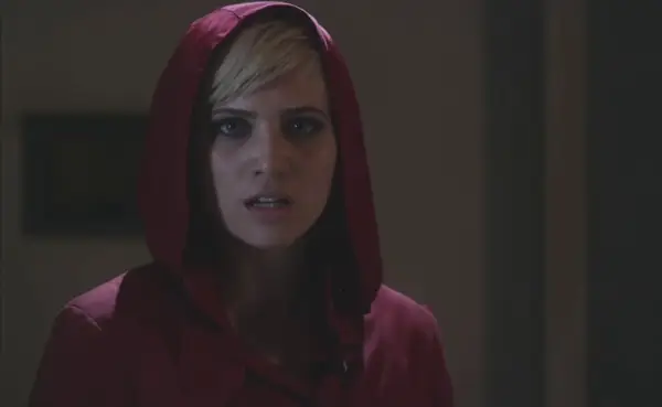 En langermet grå skjorte under det brunbrune fengselsantrekket, samt en skulderlang rød parykk med smell.